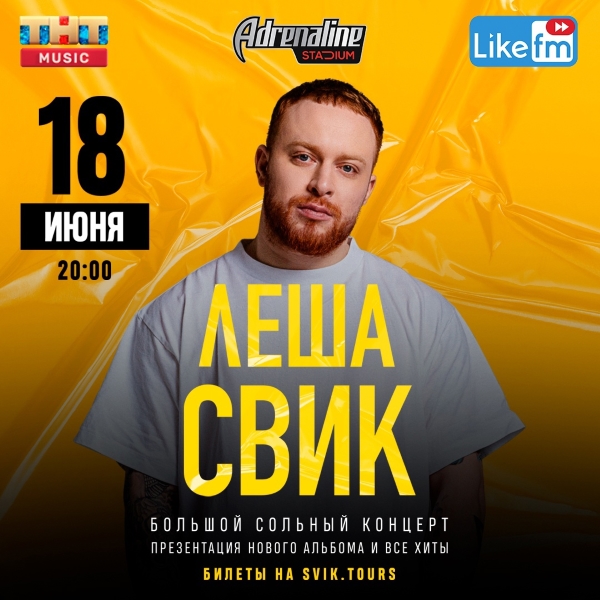 Сольный концерт Лёши Свика пройдет 18 июня в Adrenaline Stadium. Подсвеченный «Малиновым светом», в клубах «Дыма», под гул «Самолётов» прозвучит ритмичный «Paco Rabanne» – и все это в сиянии прожекторов и мощных спецэффектов.